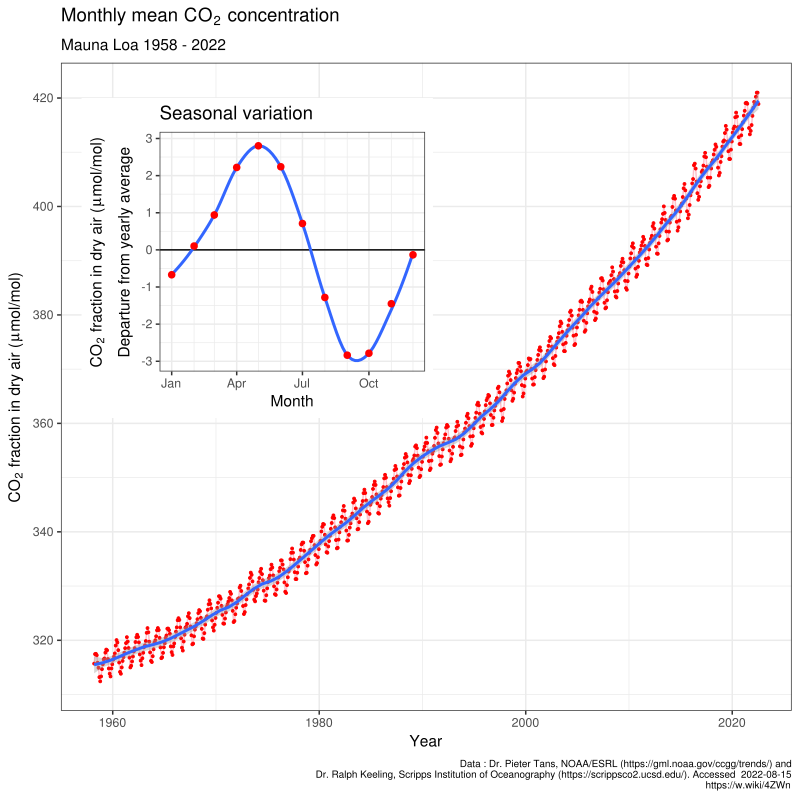For example let’s take that central bit of climate data, the Keeling Curve. It’s fairly simple. Carbon Dioxide is going up, therefore we have a problem. However, zoom in and you’ll notice a zigzag. This is seasonal variation.